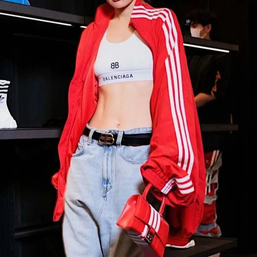 Nearly identical to Blake's Balenciaga x Adidas oversized nylon jacket-priced at $2,150! Pair with leggings, track pants, or jeans.